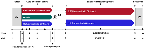 主要纳入年龄18~75岁的成人患者,需符合Hanifin和Rajka标准,确诊为轻中度AD;体表受累面积(BSA)为3%~20%;湿疹面积和严重程度指数(EASI)评分≥5分;研究者总体评估(IGA)评分为2分或3分。受试者以1:1:1的比例随机分配,分别接受每日2次的0.5%艾玛昔替尼软膏、1%艾玛昔替尼软膏或赋形剂治疗。治疗8周后,完成核心治疗阶段且初始接受赋形剂治疗的患者进入扩展阶段,按1:1比例随机分配至0.5%或1%艾玛昔替尼软膏组继续治疗;原活性药物治疗组患者则维持原方案,持续治疗至第52周。