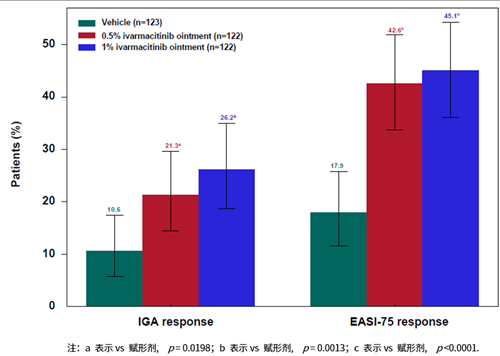 ● 第8周,0.5%艾玛昔替尼软膏组、1%组及赋形剂组的IGA应答率分别为21.3%、26.2%和10.6%。与赋形剂组相比,0.5%组和1%组的应答率差值分别为10.8%(p=0.0198)与15.6%(p=0.0013),差异均具有统计学意义。