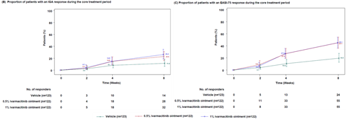 ● 在核心治疗期间,0.5%和1%艾玛昔替尼软膏组在每个访视点达到IGA和EASI 75应答的患者比例均高于赋形剂组,从基线至第8周有明显改善。